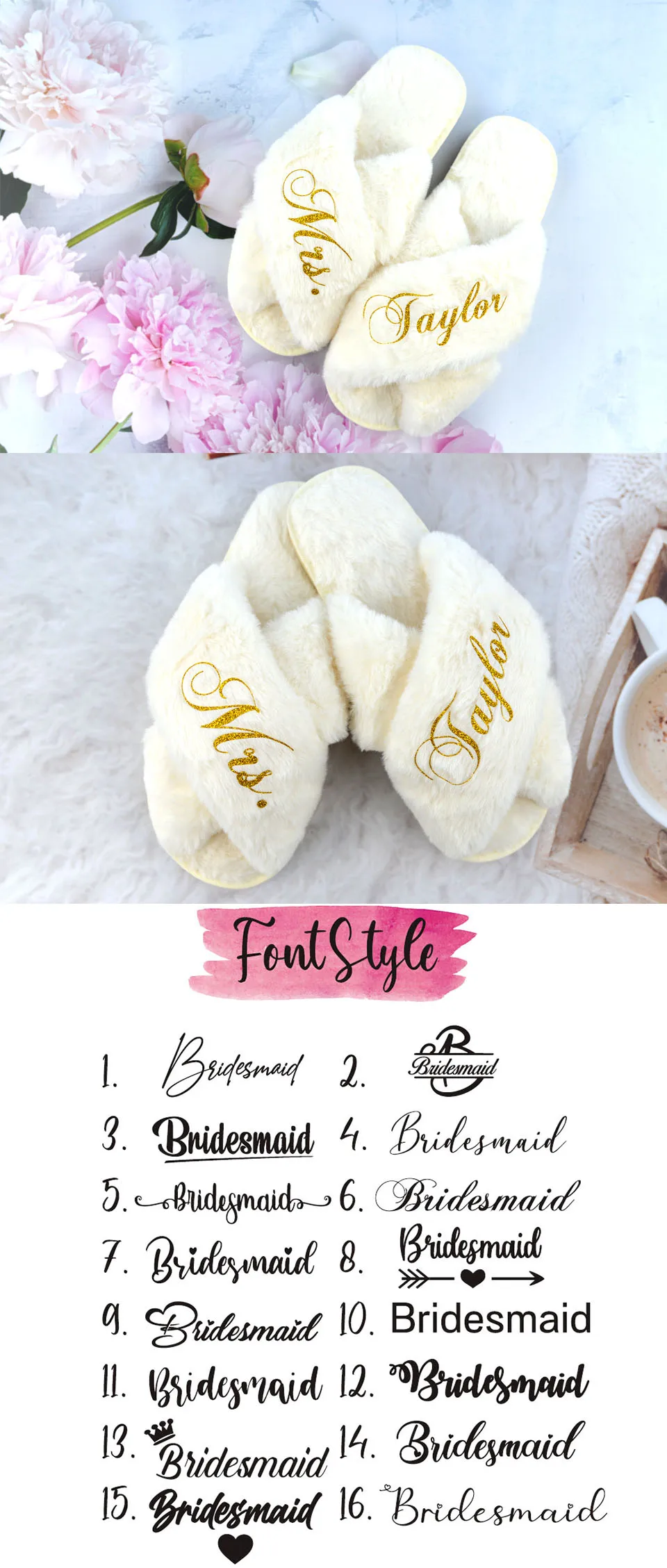 Custom Bridesmaid Fluffy Plush Open Toe Slippers Personalized Wedding Cross Flat Slippers for Women Ladies Indoor Shoes Fashion
