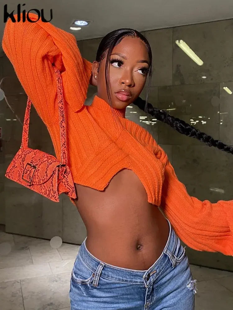 Kliou 2022 Autumn and Winter Sweater Solid Women Casual Simple Long Sleeve O-Neck Classic Skinny Bare Midriff Female Streetwear